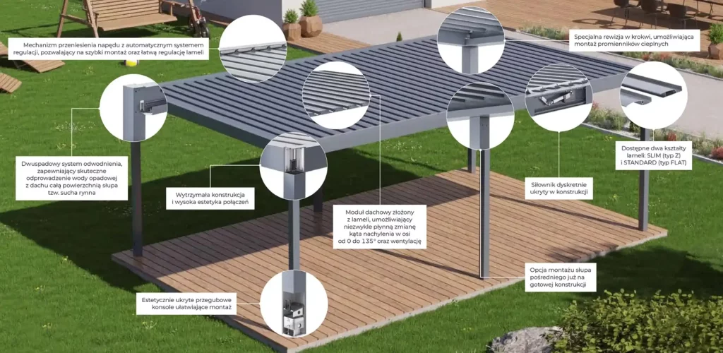 - Inteligentne zadaszenie – system automatycznego sterowania dachem regulowanymi lamelami.
